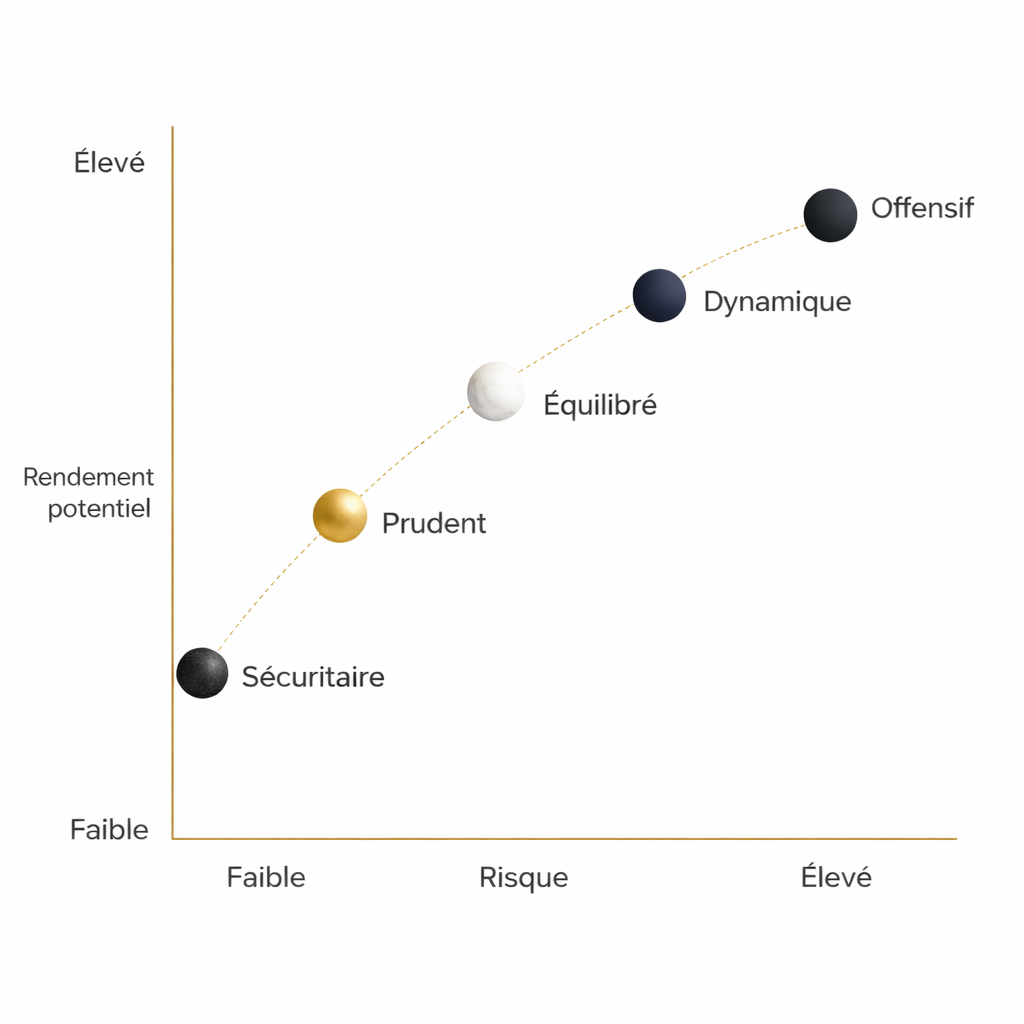 Votre tolérance au risque est évaluée à travers des scénarios de performance optimistes et pessimistes. Cette analyse permet de vous classer parmi ces 5 profils :
